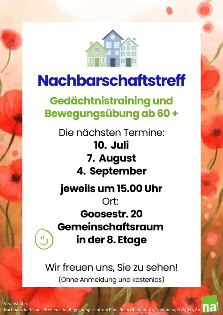Wir laden Sie herzlich zu einem abwechslungsreichen Angebot aus Gedächtnistraining und Bewegungsübungen zum Nachbarschaftstreff in der Goosestraße ein. In angenehmer Atmosphäre haben Sie die Möglichkeit, Körper und Geist gleichermaßen zu aktivieren und dabei in Gemeinschaft zu bleiben.